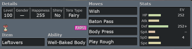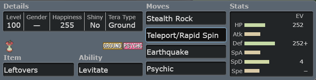 Claydol is a great defensive wall that can be used both physically and specially. It has access to both Stealth Rock and Rapid Spin. It can use Teleport for slow pivoting, and with the ability Levitate as well as Ground typing Claydol can come into hazards with little problem. Claydol stands out a defensive wall that can switch-in into Pawmot STAB attacks and threatens with Earthquake and Psychic.