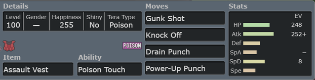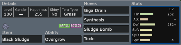 Venasaur has great typing that resist both STABs from Pawmot, it can survive an incoming Overheat from Rotom-H with no SpAtk investment and restore HP in the same turn with Synthesis. Venasaur has many tools in it’s movepool like Sleep Powder, Toxic, Leech Seed, Roar, Knock Off, Block, Light Screen and Reflect.