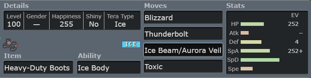 Regice is a great special wall has great chemistry with Slowking. Slowking as a partner that uses Chilling Reception allows Regice to come in with Snow and ditch out high damage with Blizzard, and support teammates with Aurora Veil and Toxic. While Snow is active, Ice Body activates and helps Regice to stay alive longer.